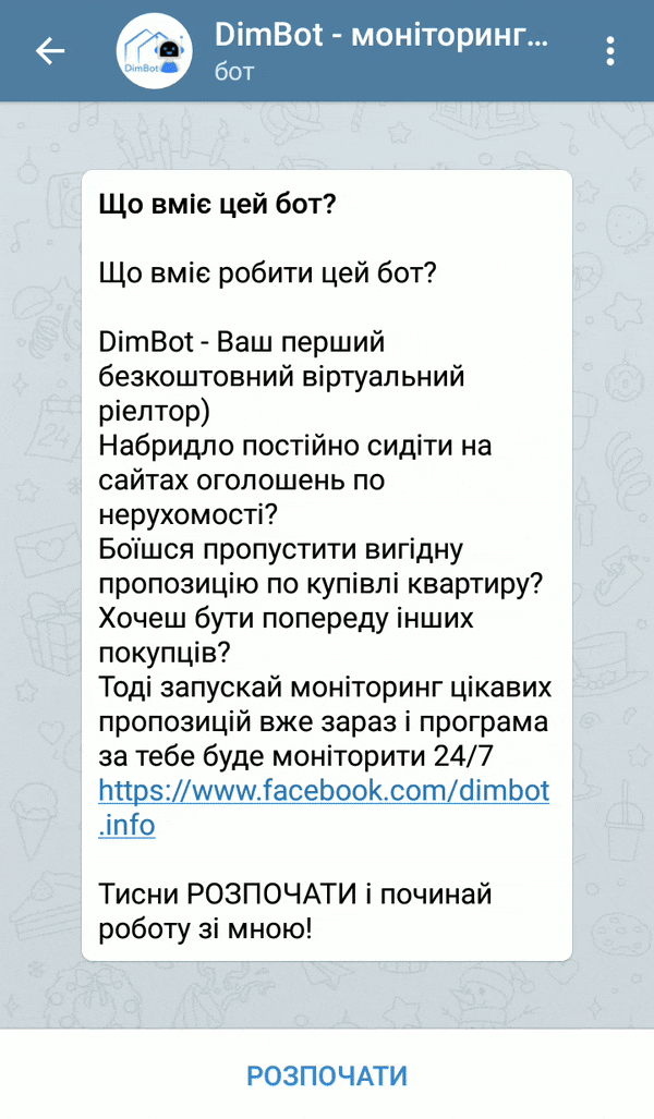 Вам більше не потрібно шукати та постійно моніторити інформацію на дошках оголошень, сайтах з нерухомості, соцмережах тощо. Це за Вас зробить сервіс DimBot, який завжди під рукою у Вашому смартфоні.